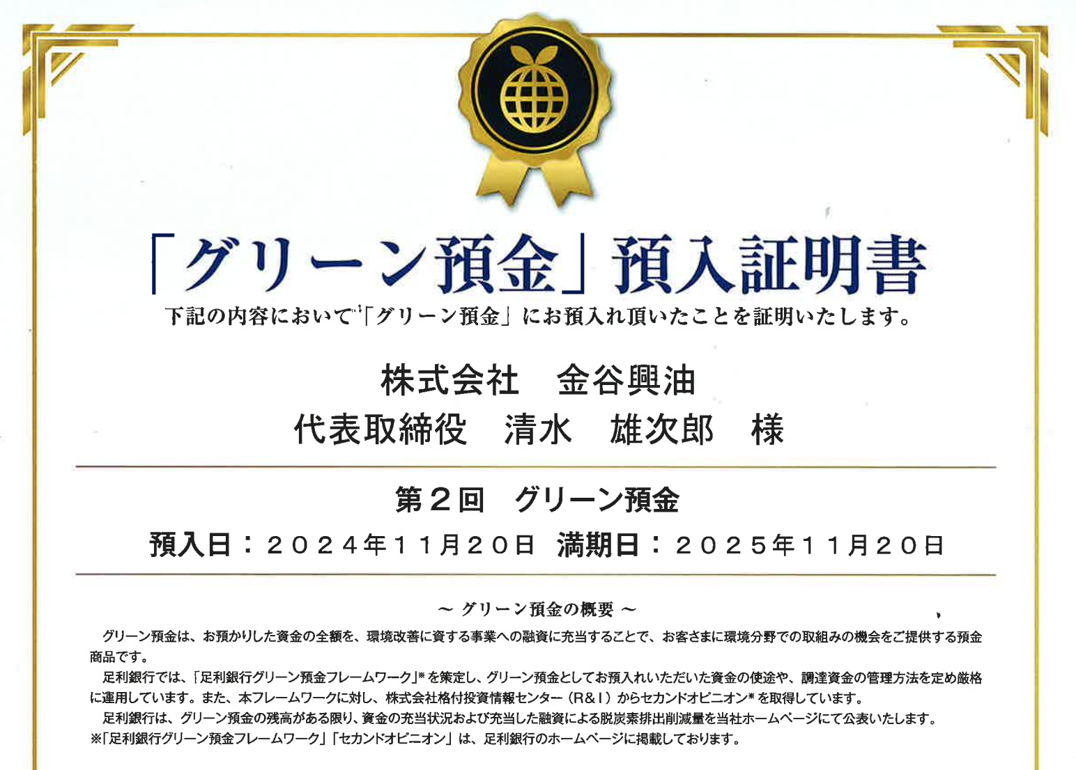 このたび当社は、足利銀行の「グリーン預金」に預け入